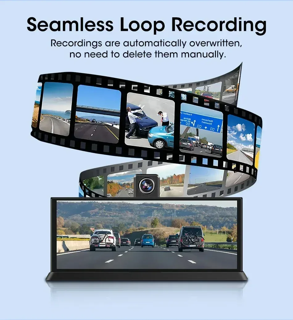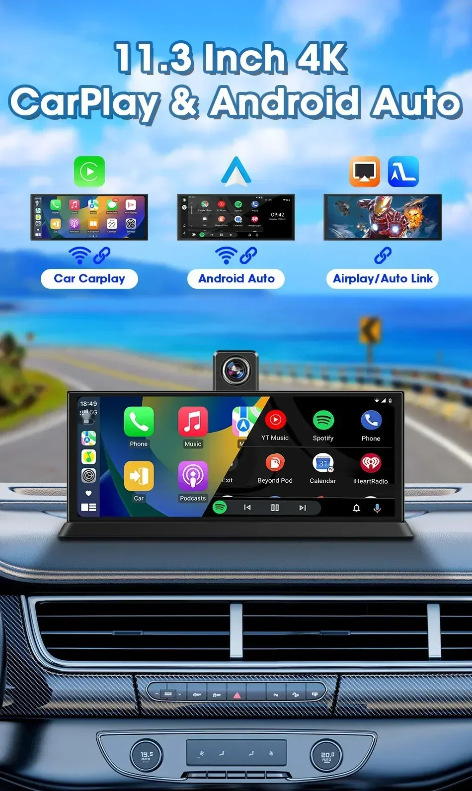 11.3 inch Dashcam 4K 360° Rotating Camera Wireless Carplay Android Auto Dash Cam Video Recorder Dashboard Car DVR FM AUX