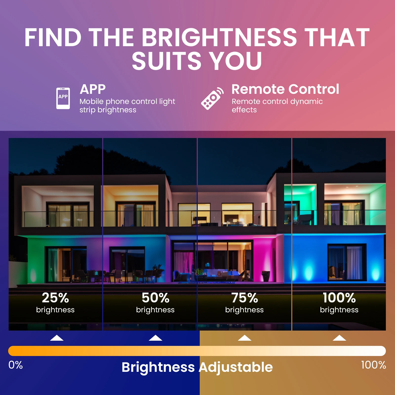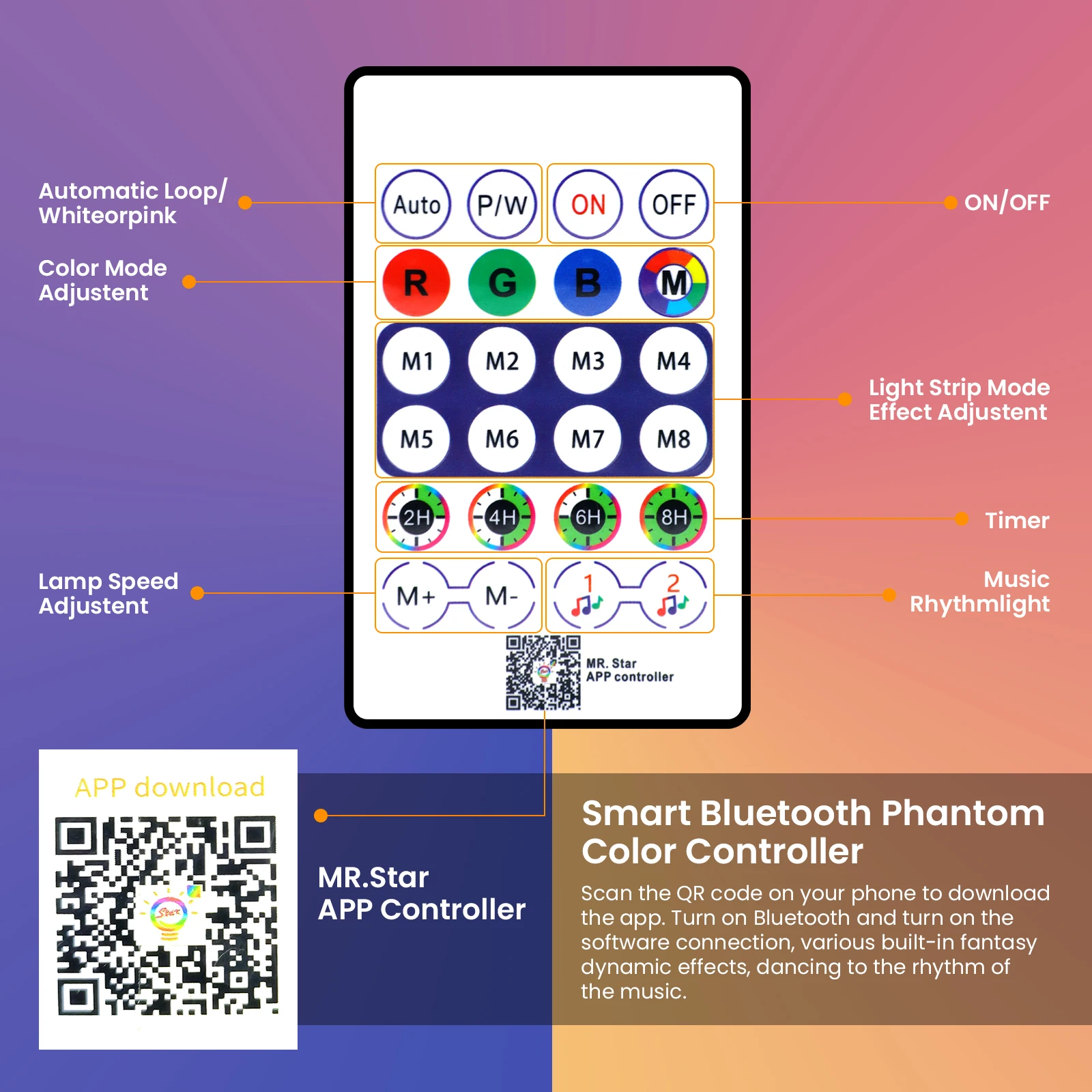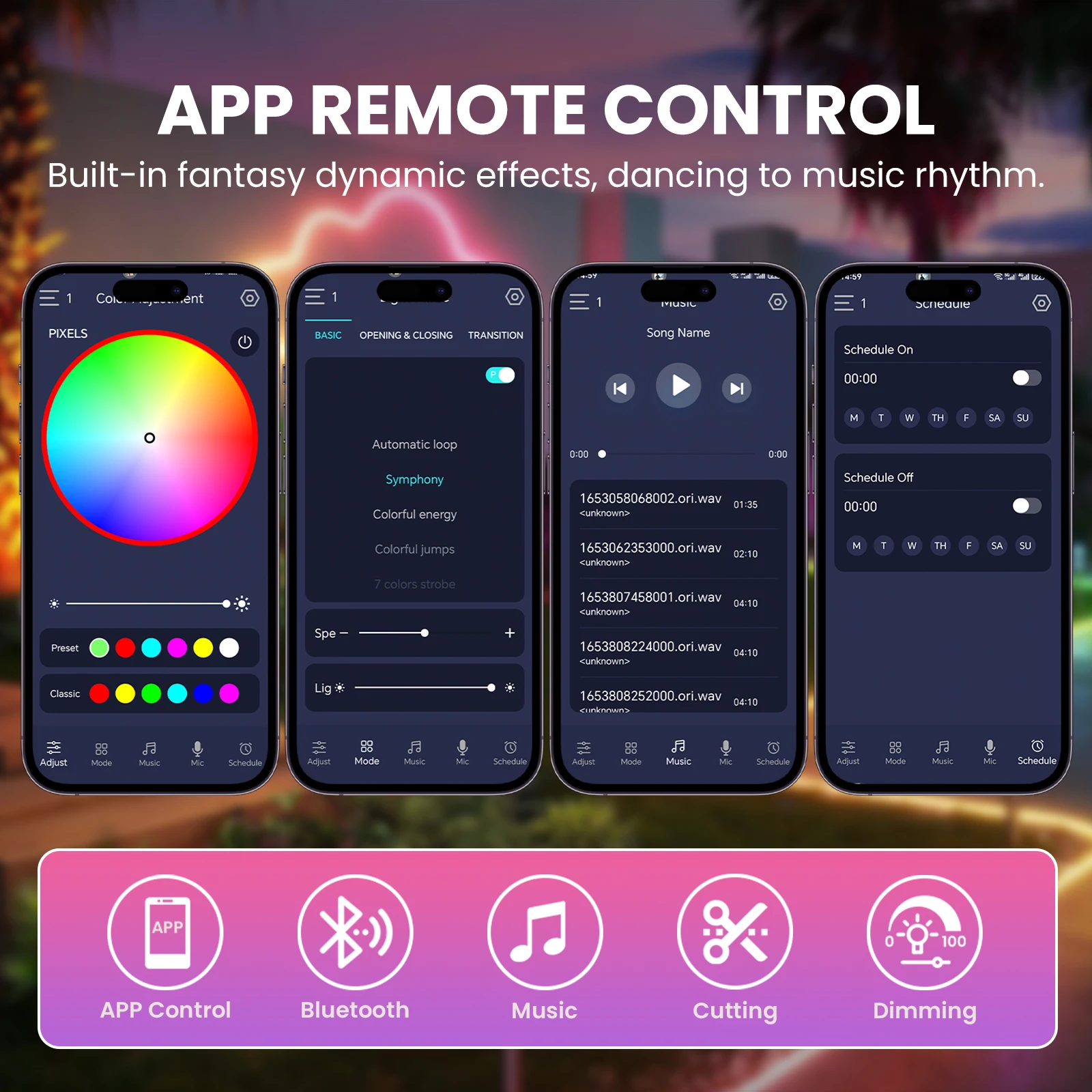 APP+Remote Control:Adjust brightness, change colors, set dynamic modes (flash, fade, strobe, smooth), and customize speed or timing.