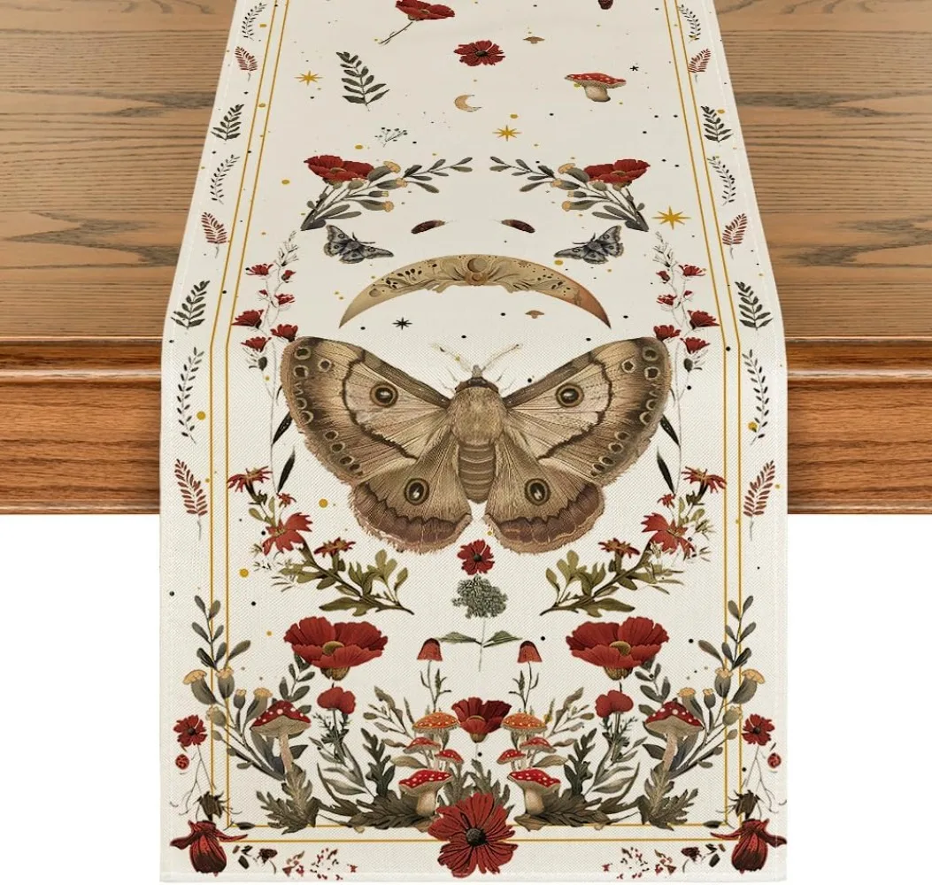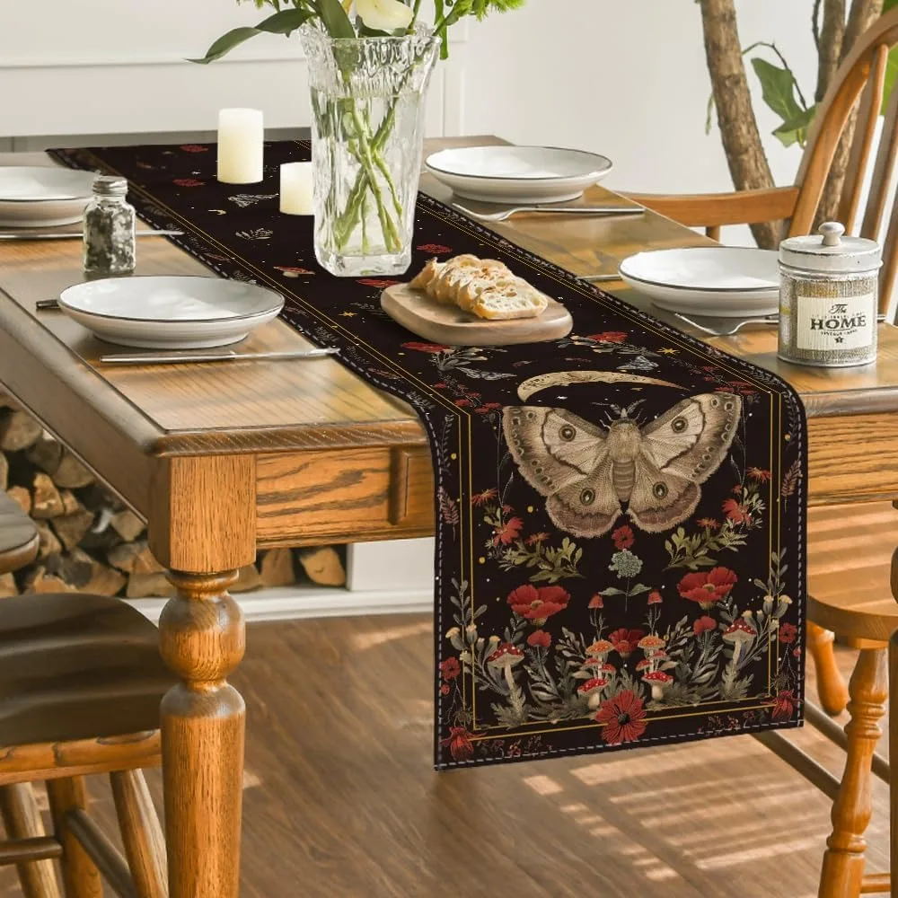 Artoid Mode Poppy Moth Mushroom Moon Fall Table Runner, Seasonal Autumn Kitchen Dining Table Decoration for Home Party Decor