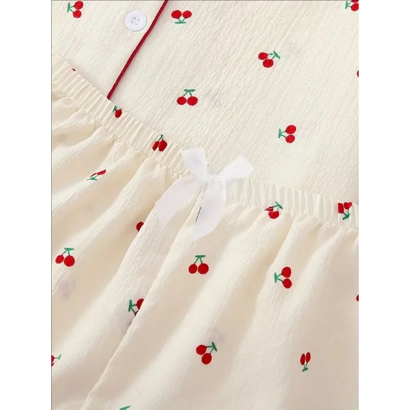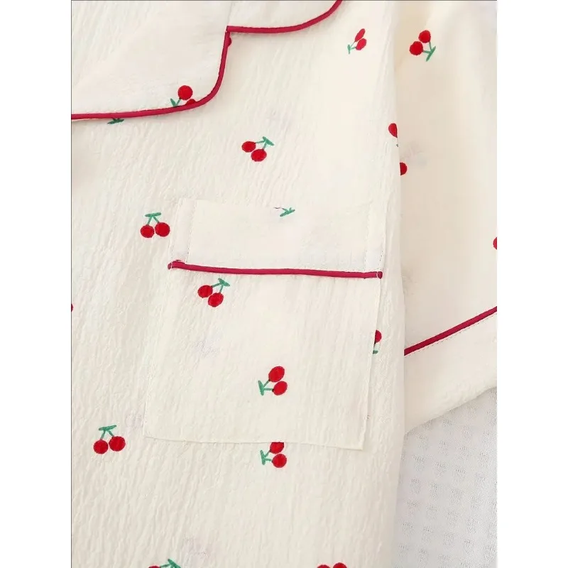 Four Seasons Women Nightwear Cherry Print Cardigan Loungewear Short Sleeve Shorts Girl Sweet Korean Fashion Pajamas Homewear