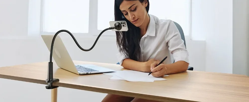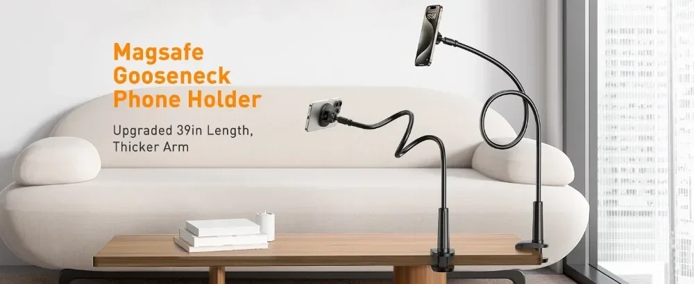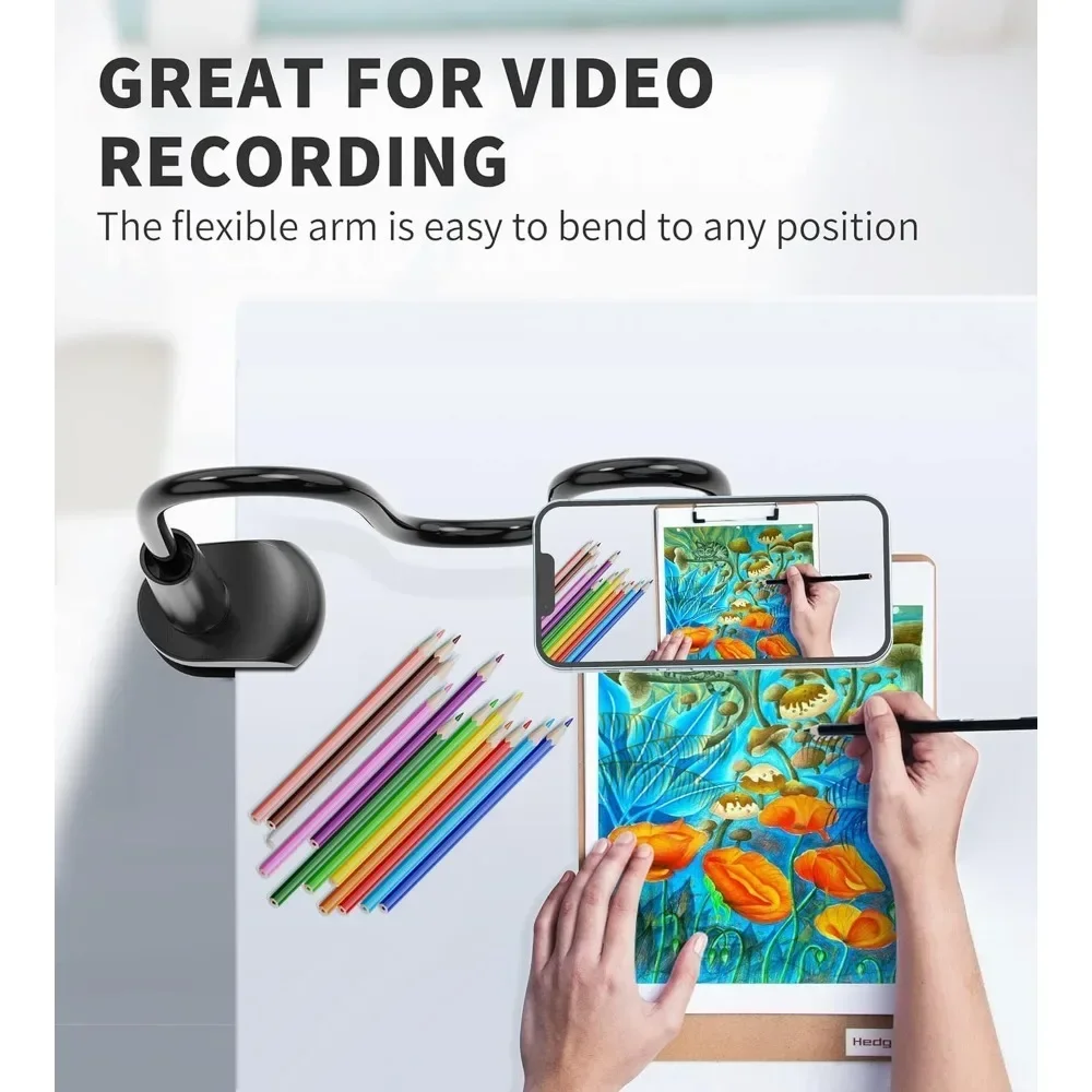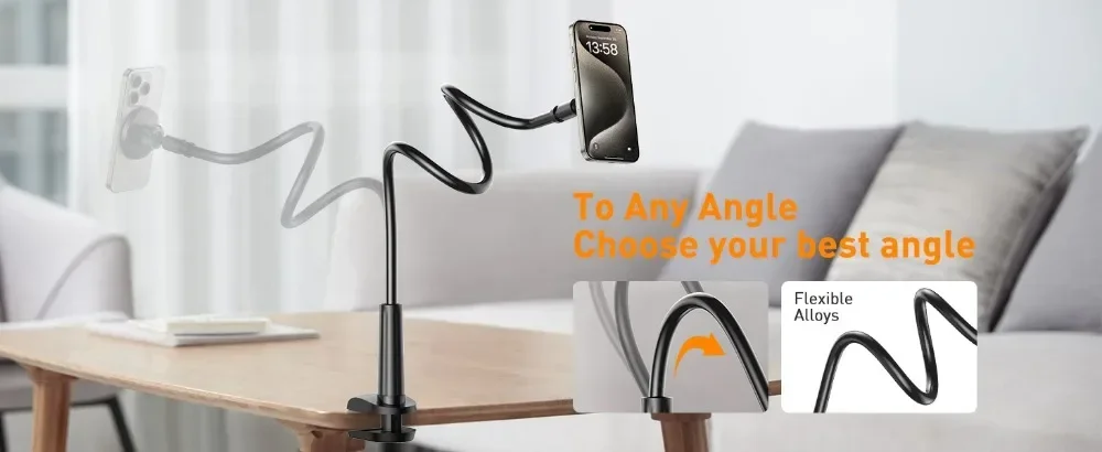 One hand experience including: Watching videos while eating, lying in bed/sofa, cycling, cooking, working at the desk, quickly record and review when filming videos, overhead camera angle, etc. Our enhanced wider clamp base can be securely mounted onto a desk, bedframe, bedside, headboard, indoor bike handle, counter, and more. The magnetic mount allows unlimited viewing angles for more flexibility while scratch-protection/non-slip silicone protects your furniture.