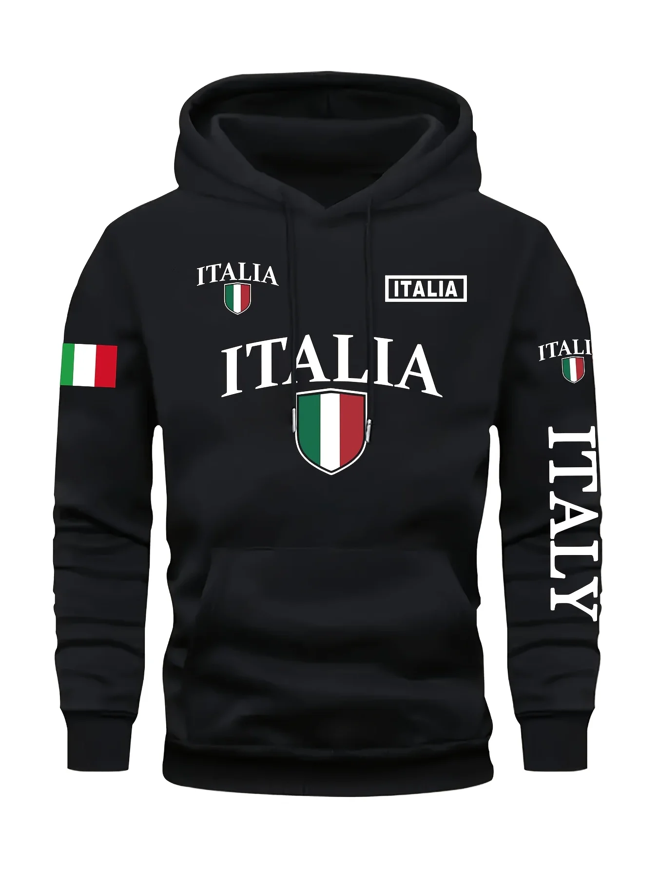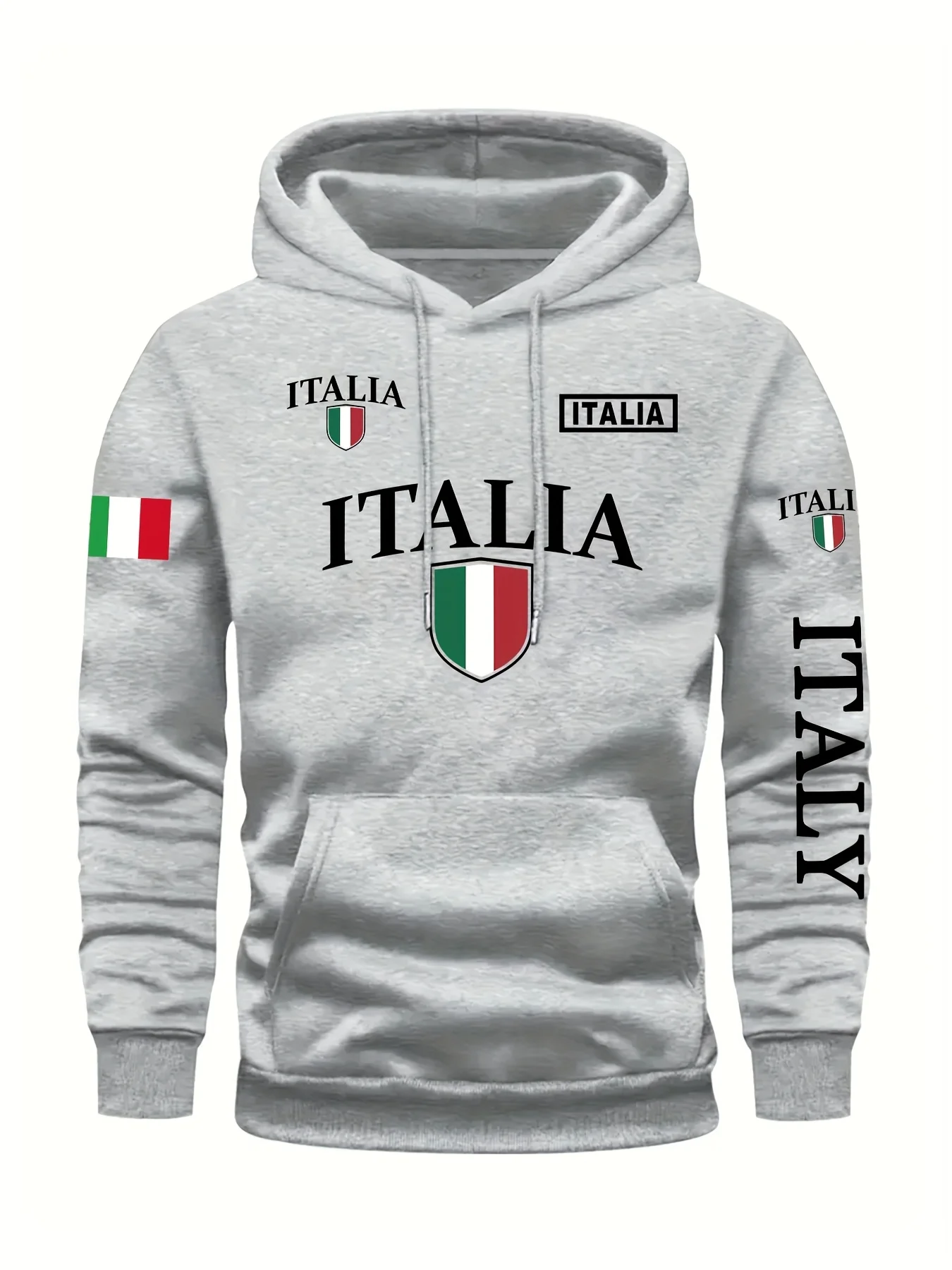 Men's Italy Flag Shield Bold ITALY Letter Print Hoodie Grey Casual Pullover Front Pocket Ribbed Cuffs Comfort Fit Urban Fashion