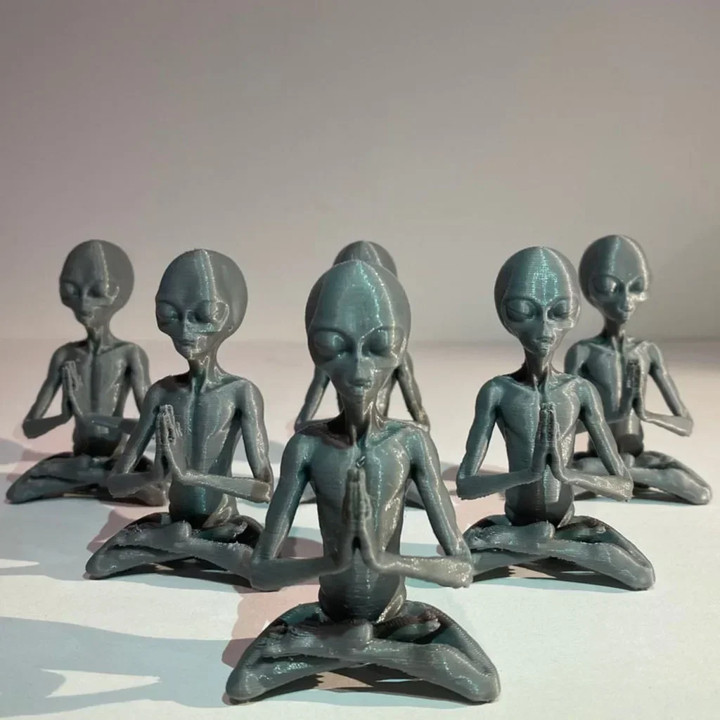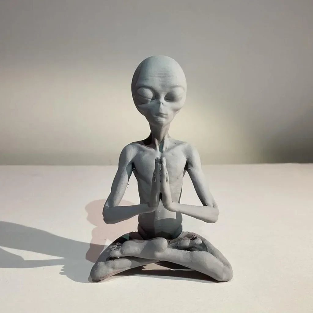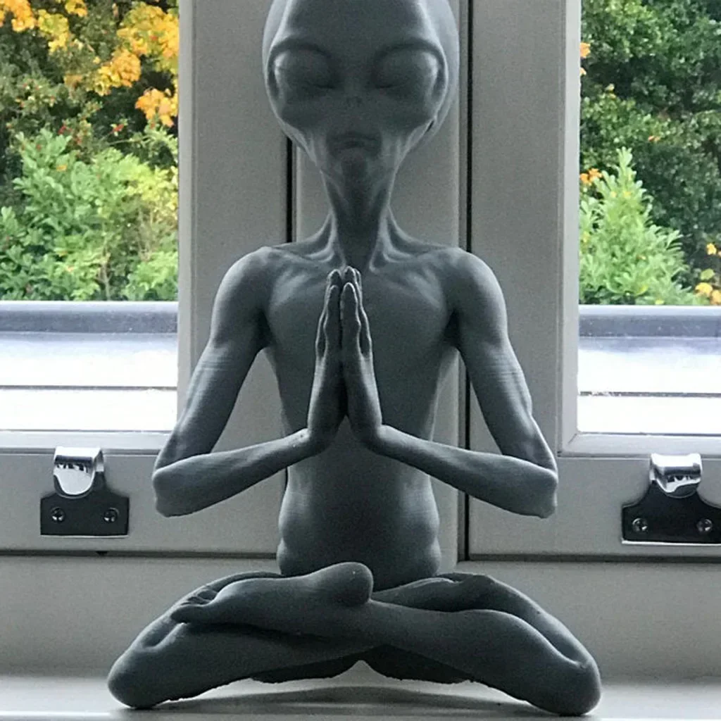 Mysterious Meditating UFO Extraterrestrial Alien Sculpture Ornament Figurine Statue Desktop Art Wood Guest Console Table Decor