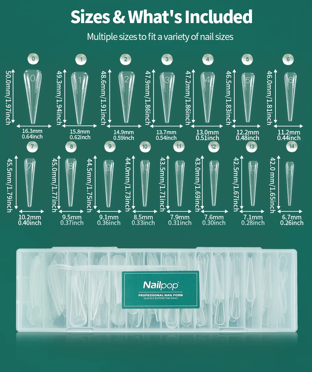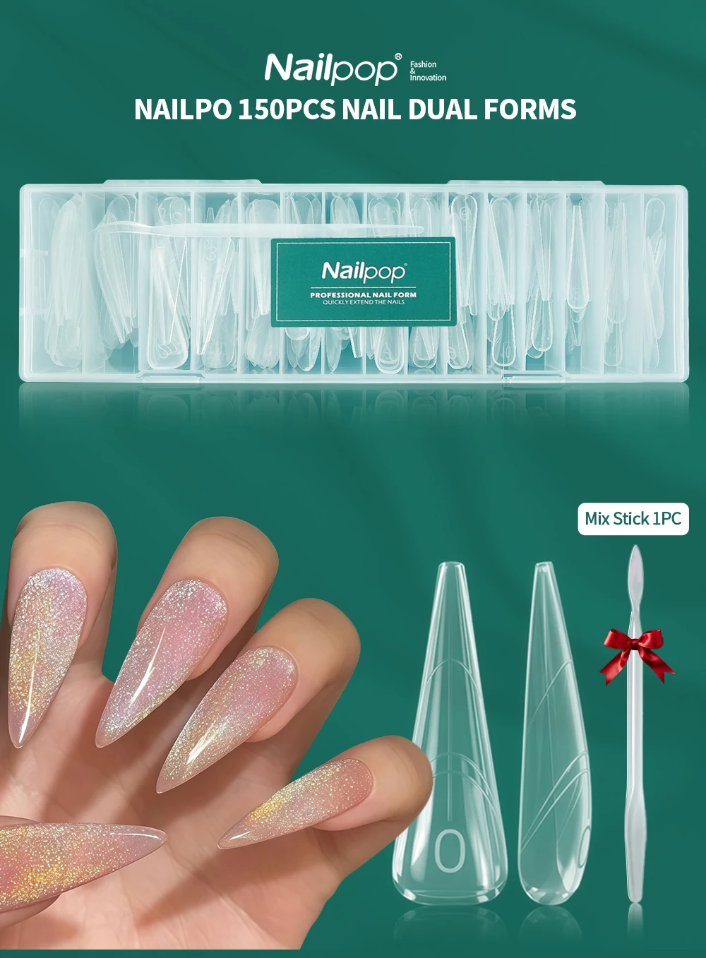 Nailpop 150PCS Clear Dual Nail Forms 15 Sizes Triangle Tip Extension Molds for Acrylic Gel Builder Reusable Shaping Art DIY