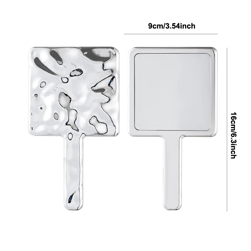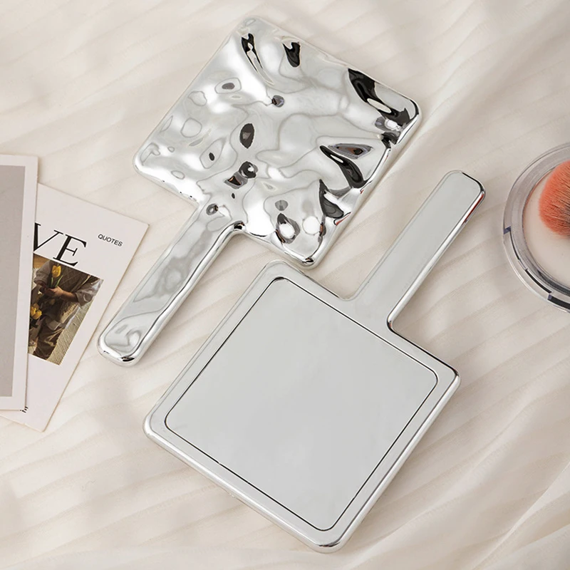 1. This stylish handheld mirror with a silver electroplated finish, features an irregular water ripple design on the back, giving it a modern and fashionable look.