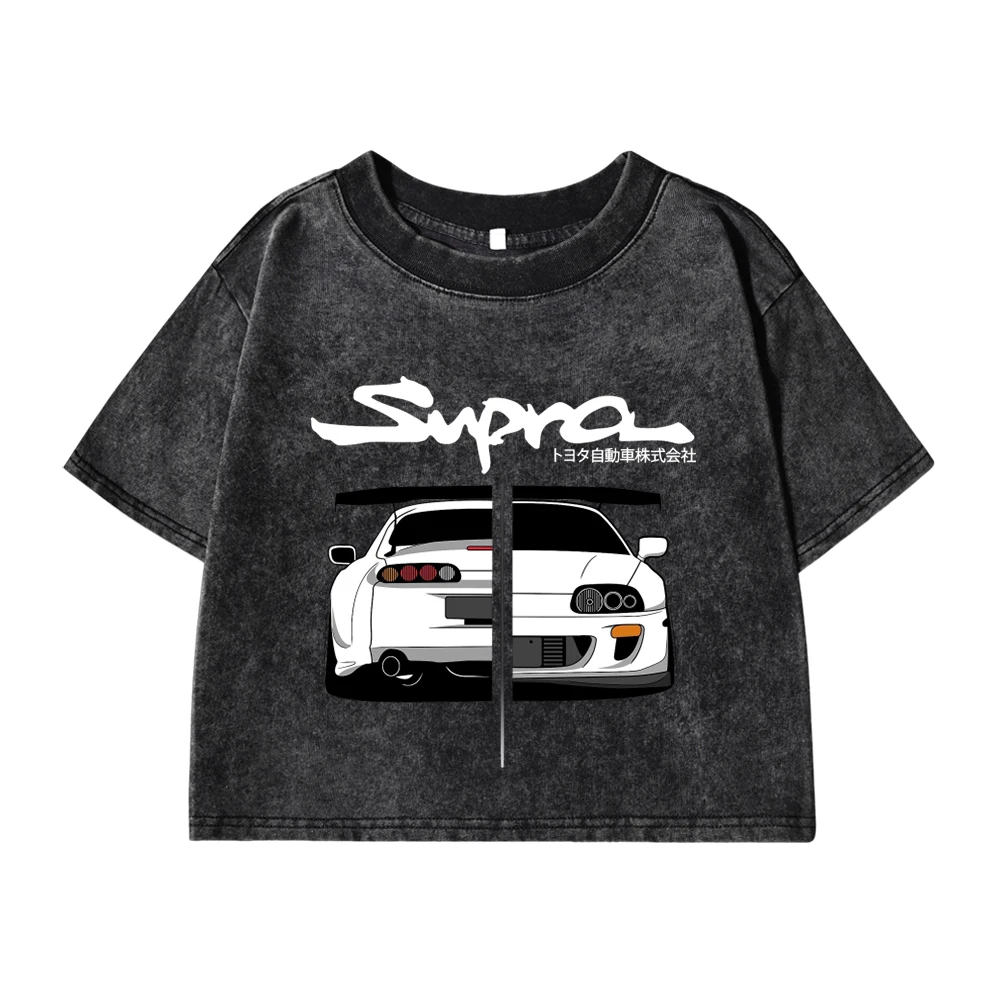 Woman Cotton Washed T-Shirts Street Regular O-Neck Crop Tees Japanese Style Cool Car Puzzle Print Short Sleeve Summer Clothes