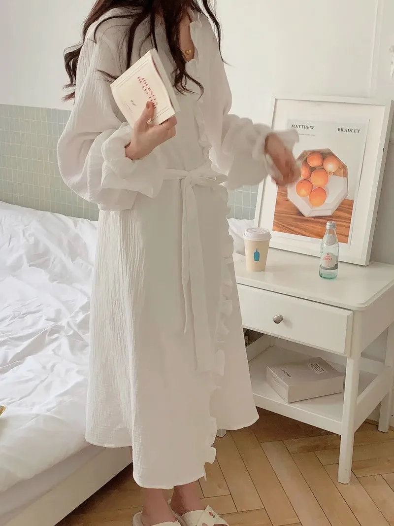 Women's Spring and Summer New Simple Long-Sleeved Robe Girls Sweet Ins Wind Ruffled Thin Section of Solid Color Pajamas Home Wea